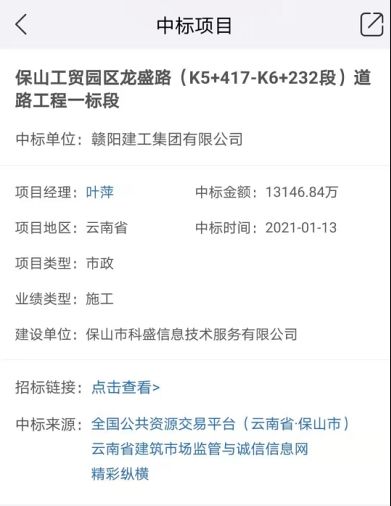 热烈祝贺赣阳建工集团有限公司喜中保山工贸园区龙盛路(K5+417-k6+232段)道路工程一标段的市政项目,中标金额为13146.84万。