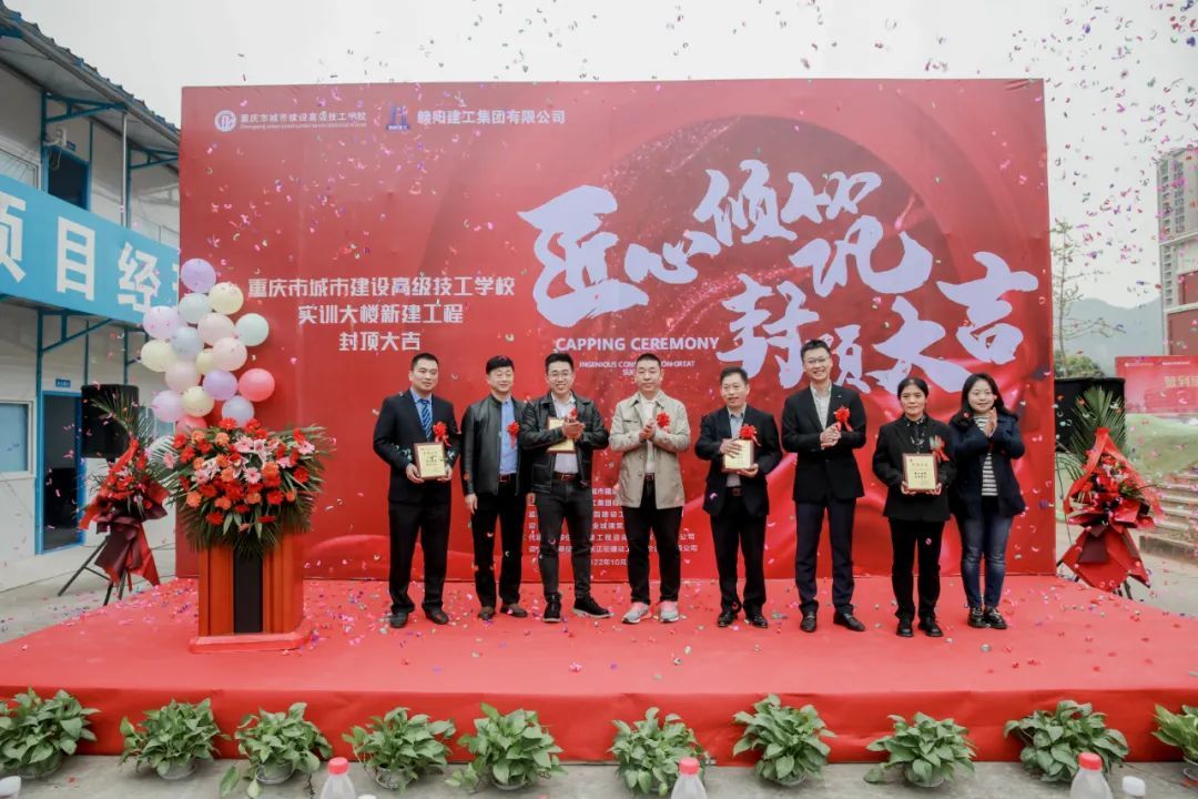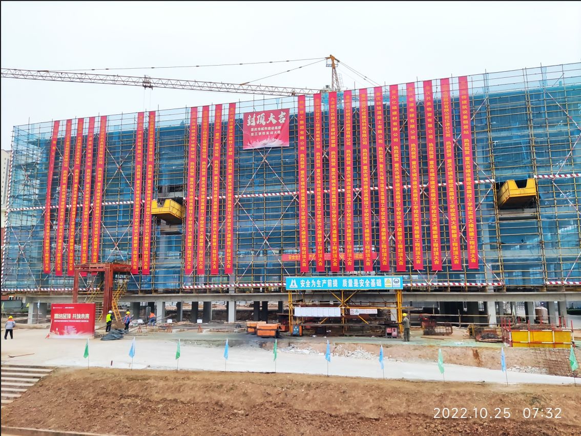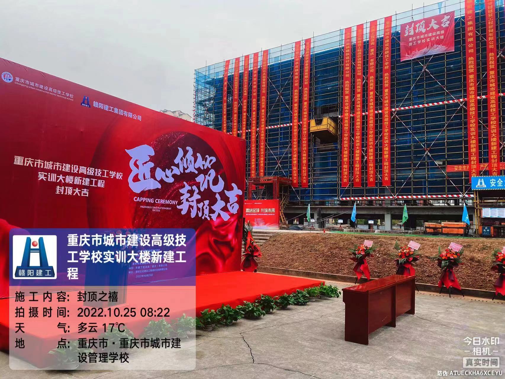 用心铸就品质,匠心筑造精品!赣阳建工集团有限公司承建的重庆市城建高级技校实训大楼新建工程项目顺利完成了主体封顶,于2022年10月25日在工地现场举行了简朴而隆重的封顶仪式。